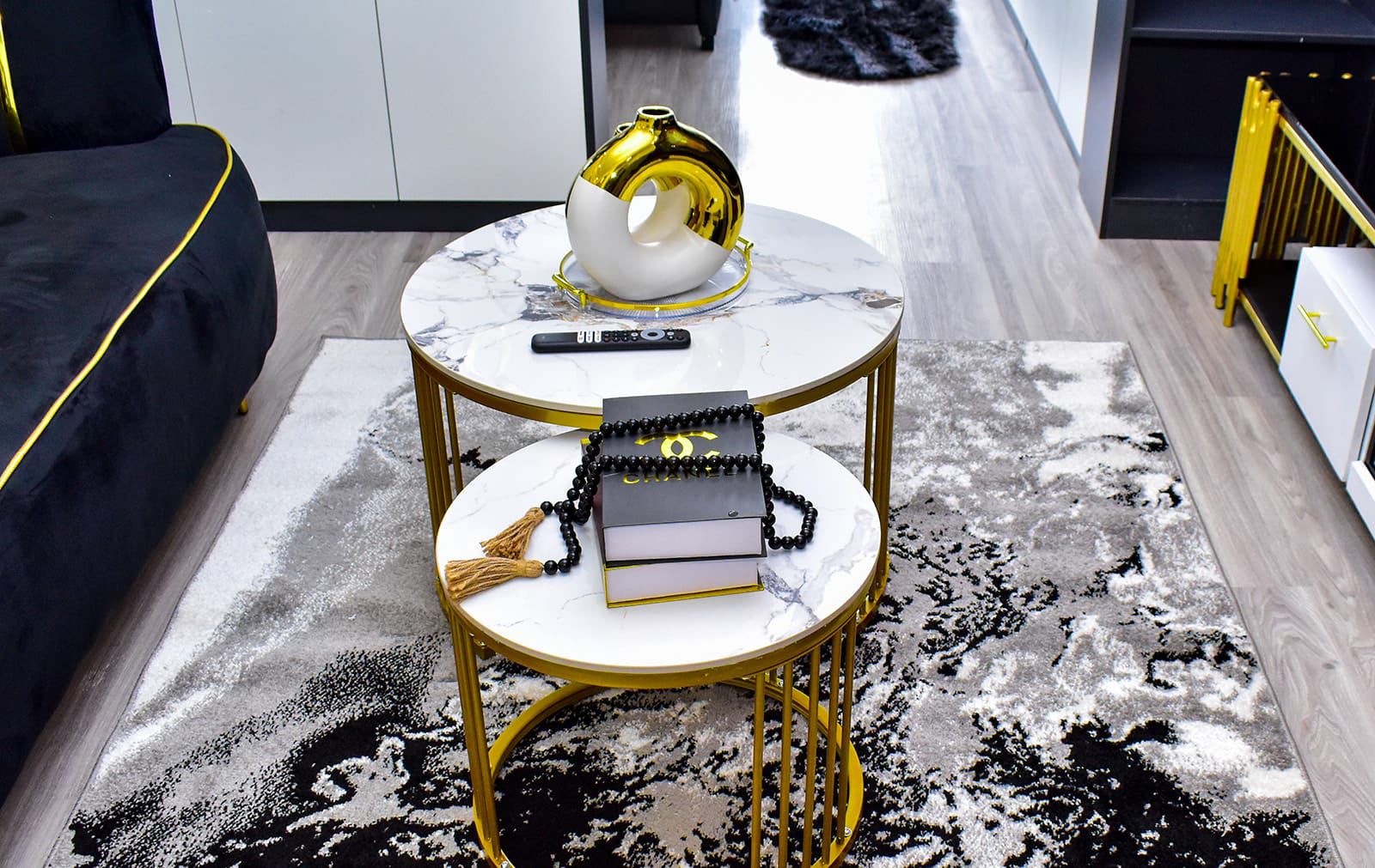 - Black and gold-themed furniture and décor