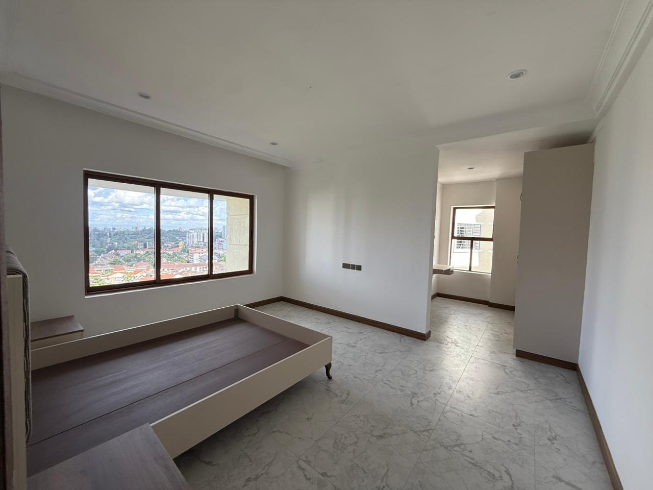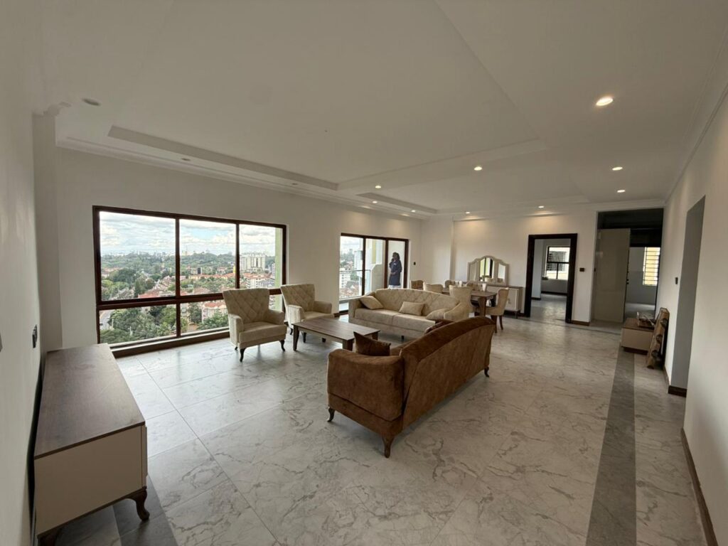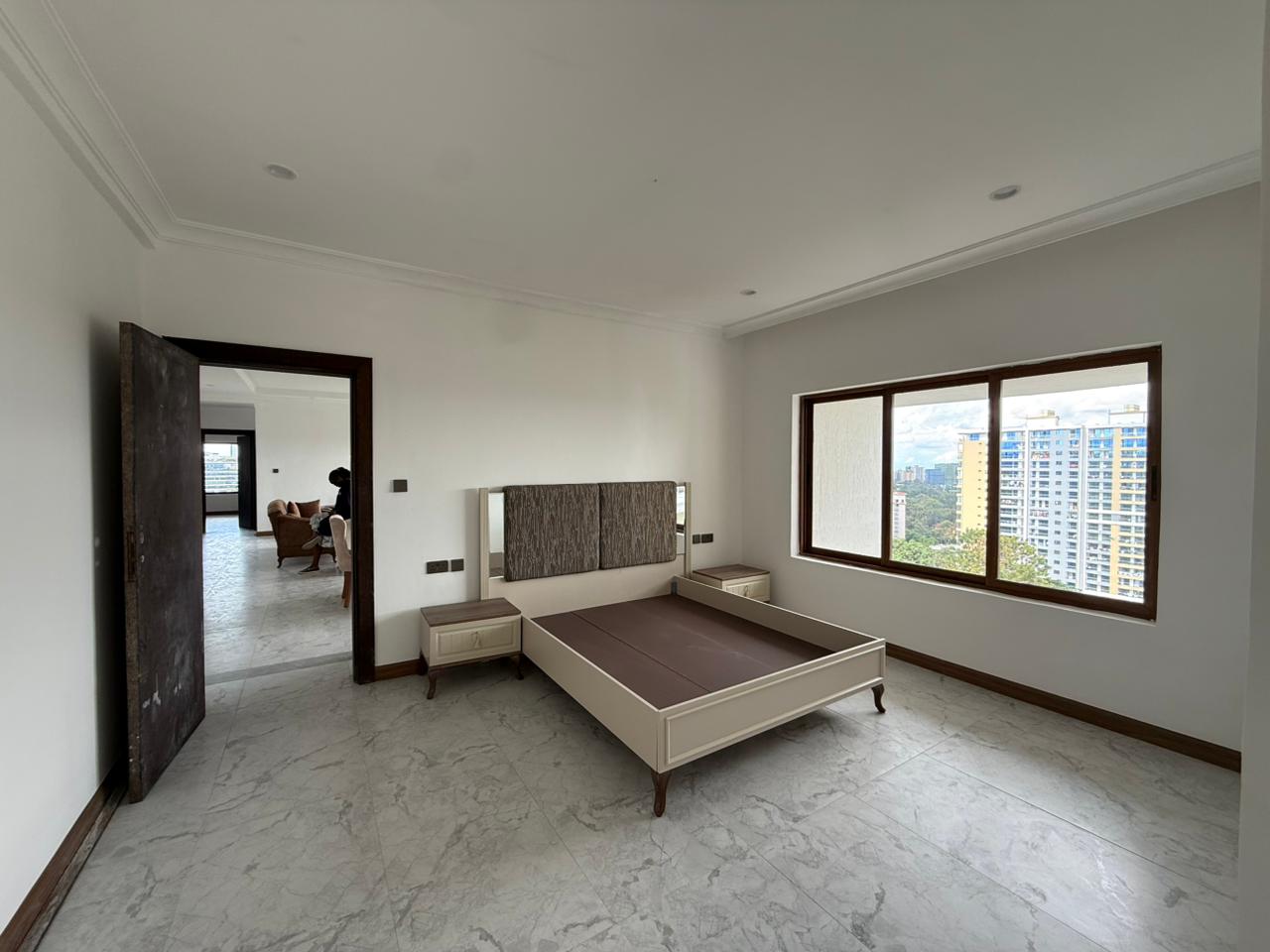 This apartment comes with self contained DSQ and all bedrooms en-suite, ensuring every occupant enjoys total privacy. You will be living in unmatched proximity to essential social amenities, situated just moments away from Quick Mart Kileleshwa, Kasuku Shopping Center, and Kileleshwa Medical Plaza. The interior features a grand open-plan layout with a dedicated family room, elegant vitrified marble-style flooring, and a modern kitchen with high-end cabinetry. From your private balcony with anti-skid tiling, you can enjoy breezy views of the surrounding greenery, while the building’s amenities like the swimming pool and fully equipped gym, provide a resort-like lifestyle every day.