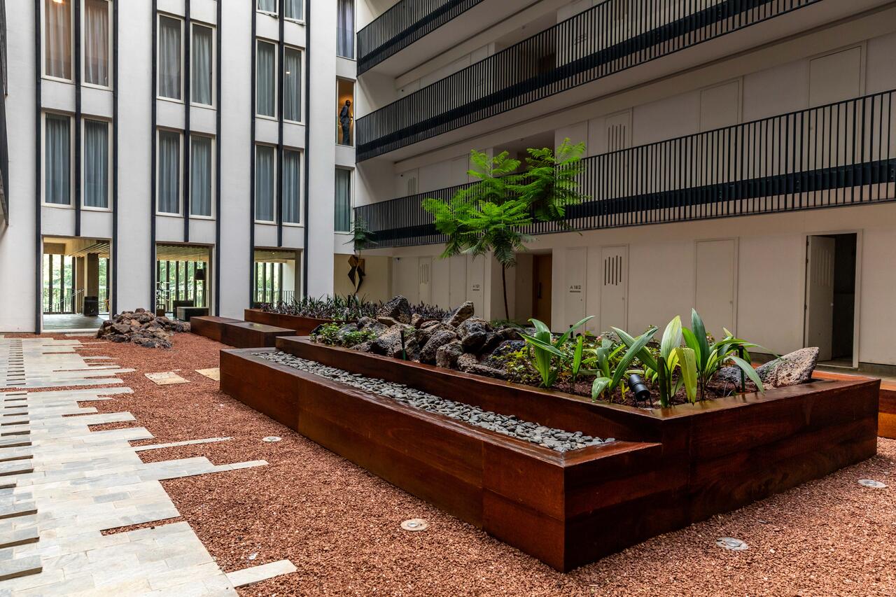 - Landscaped areas with vertical gardens and water features